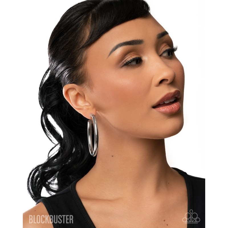 A thick silver bar delicately curls into a glistening oversized hoop for a retro look. Earring attaches to a standard post fitting. Hoop measures approximately 2 1/4" in diameter.