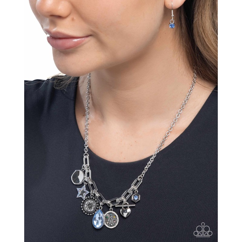 Connecting along an abstract silver chain, a collection of thick elongated silver paperclip chain links are joined by doubled subtly hammered silver links below the neckline. Sashaying below the links, a collection of show-stopping charms including a concaved hammered silver disc, a light sapphire iridescent-rhinestone bordered silver star, a studded three-dimensional star disc, a blue gem teardrop, a multicolored rhinestone-dotted symbolic pendant with a hammered backdrop and white rhinestone border, a heart padlock, and a light sapphire gem in a silver hexagon pendant swing for eye-catching eclectic detail. Features an adjustable clasp closure. Due to its prismatic palette, color may vary.