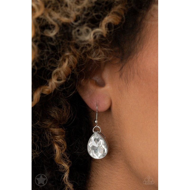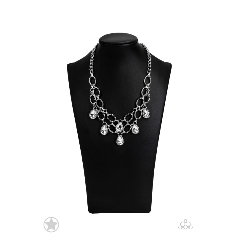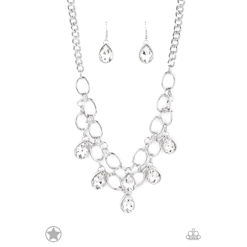 Joined by dainty silver links, two rows of dramatic silver chain layer below the collar in a fierce fashion. Glittery white teardrops drip from the glistening layers, adding a timeless shimmer to the show-stopping piece. Features an adjustable clasp closure. Sold as one individual necklace. Includes one pair of matching earrings. Note: This is a blockbuster item and is listed as a pre-order. Blockbuster items are ALMOST always available; therefore, I do not keep these in my inventory. Limited availability may apply.