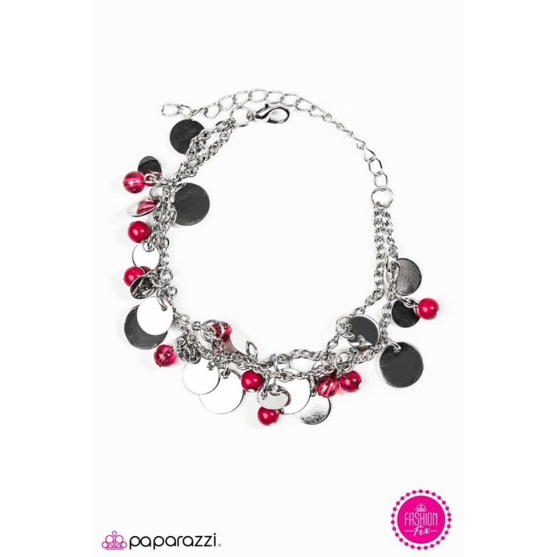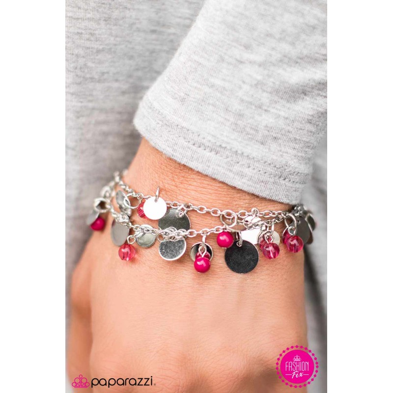 Shimmery silver discs join cerise beads in varying opacity along two shimmery silver chains, creating flirty layers around the wrist. Features an adjustable clasp closure.
