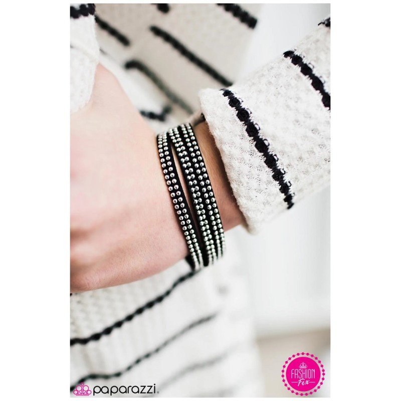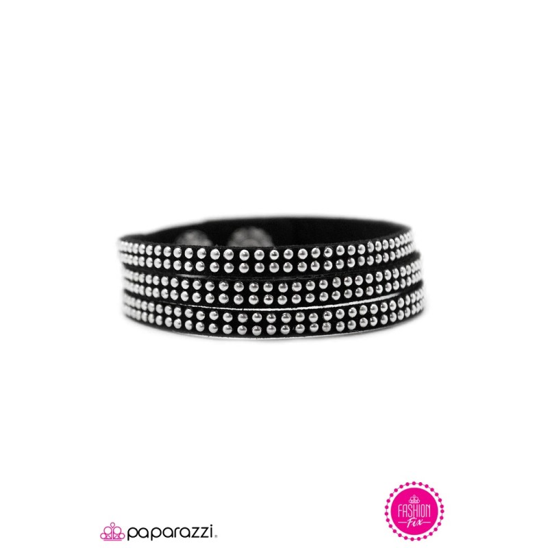 A strip of soft black suede is slit into three smaller strands. Each strand is lined with silver studs, adding brilliant light-catching texture to the piece. Features an adjustable snap closure.