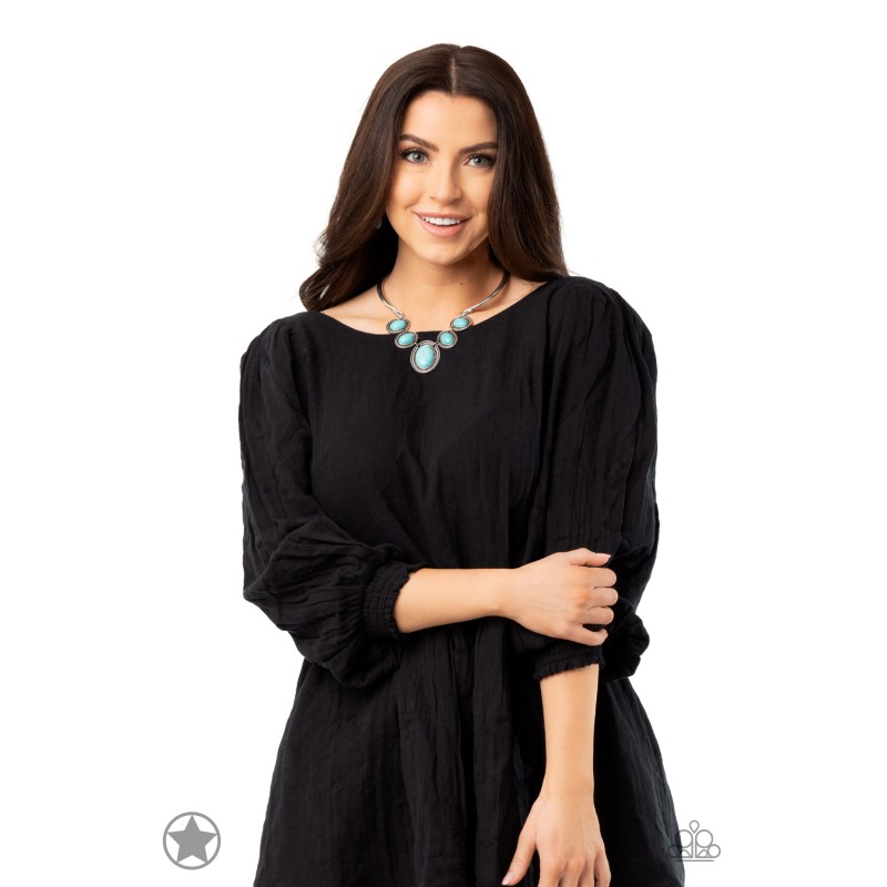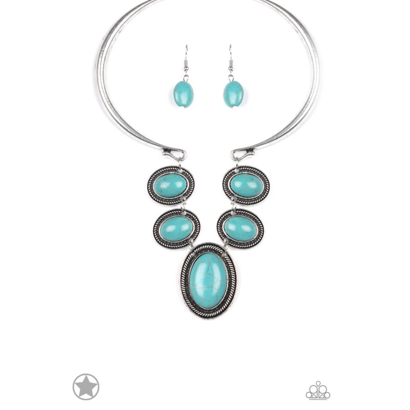 Two antiqued silver bars curl around the neck as they give way to a row of refreshing turquoise stones that falls delicately below the collar. Each stone is encased in a textured silver frame, adding a traditional artisanal flair to each unique pendant. Features an adjustable clasp closure.