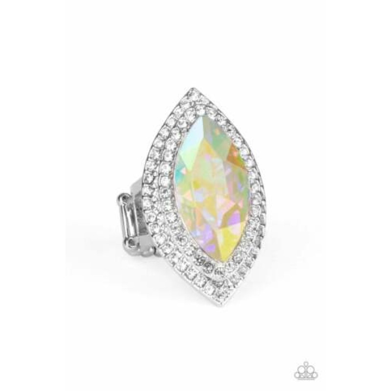 Rows of glittering emerald cut white rhinestones crisscross across the finger inside silver frames lined with dainty white round rhinestones resulting in a glamorously stunning finish. Features a stretchy band for a flexible fit. (One size fits most)