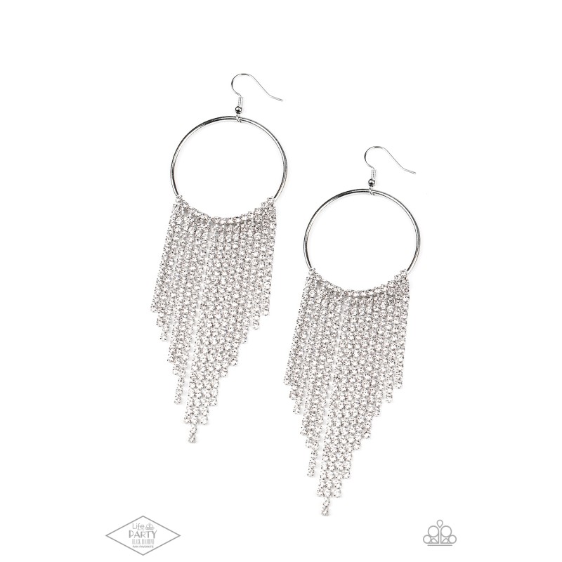 Tapered rows of glittery white rhinestones cascade from the bottom of a shiny silver hoop, creating a glamorously glitzy fringe. Earring attaches to a standard fishhook fitting.