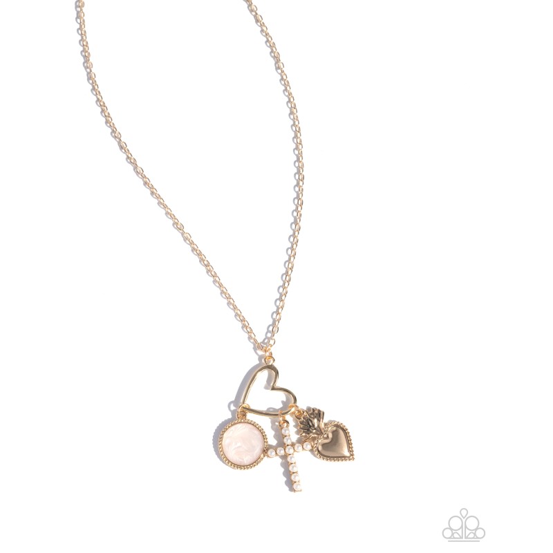 A collection of gold charms, including a heart outline, a pearl-painted round disc, a pearl-encrusted cross, and an embossed heart, dangles from a delicate gold chain, creating a sentimental design. Features an adjustable clasp closure.