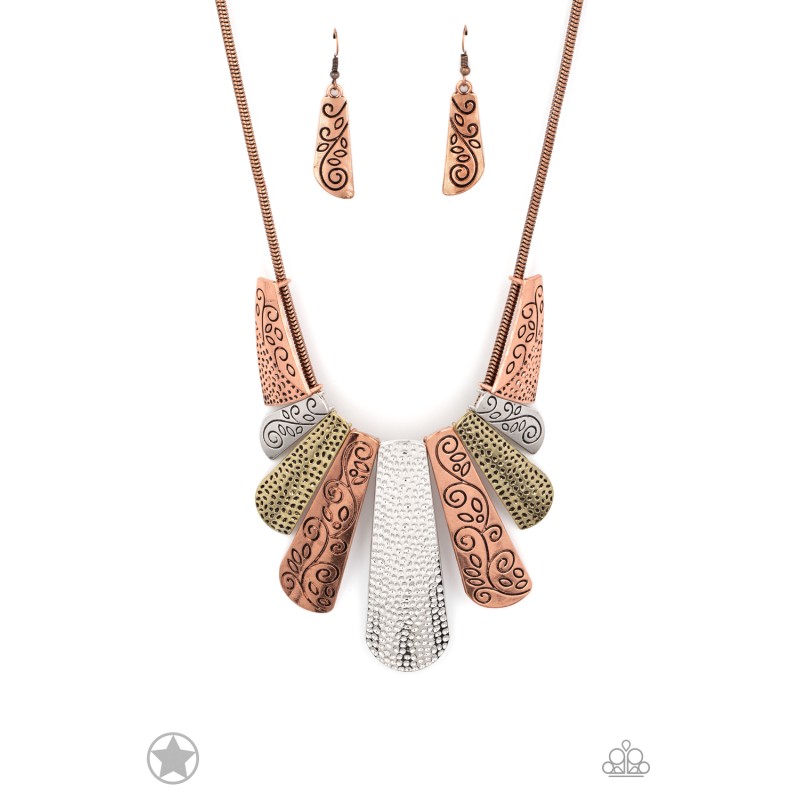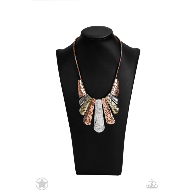Copper, silver and brass plates featuring various hammered and filigreed textures fan out across the chest along a thick copper snake chain. The gorgeous tribal design falls gracefully below the collar into a dramatic statement piece. Features an adjustable clasp closure.