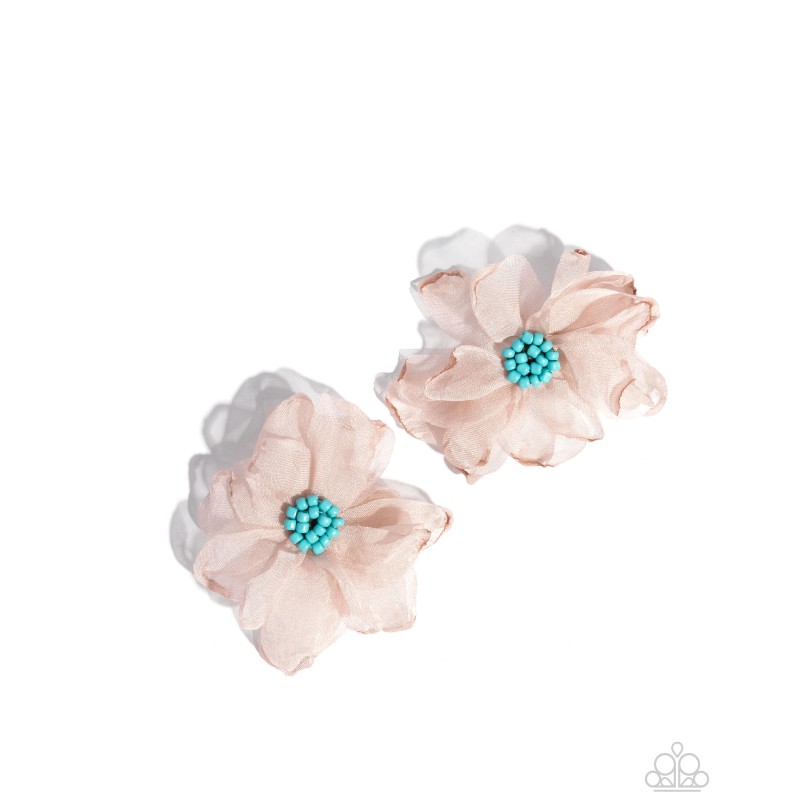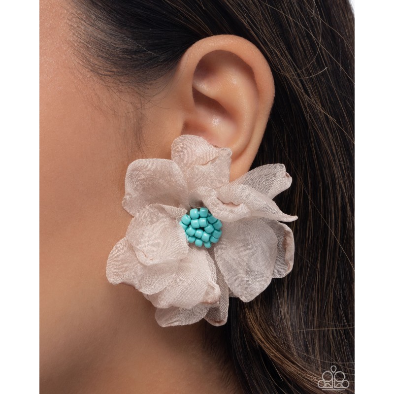 Featuring tiffany seed beads, cool light brown tulle petals flair out along the ear for a whimsically wondrous look. Earring attaches to a standard post fitting.
