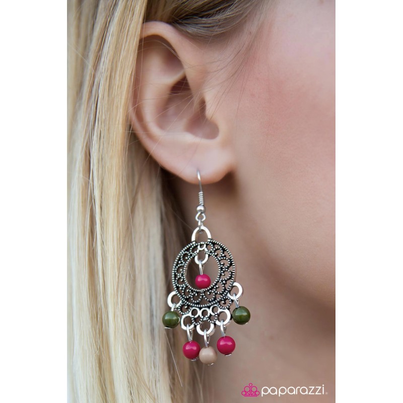 An ornate frame swings from the ear in a glamorous fashion. Multicolored beads cascade from the bottom of the silver frame, while a pink bead swings from the top for a colorful finish. Earring attaches to a standard fishhook fitting.