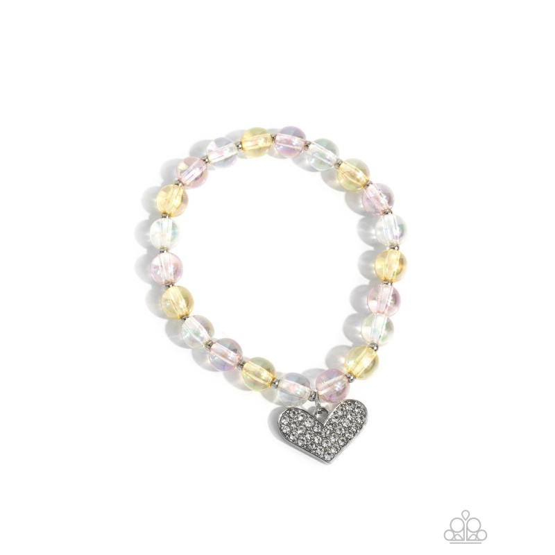 Featuring an iridescent finish, a collection of transparent Primrose, white, and light pink beads are infused along an elastic stretchy band, alternating with silver beads for a colorfully chic pattern. A white rhinestone-dusted silver heart pendant swings from the display for a heartfelt finish.