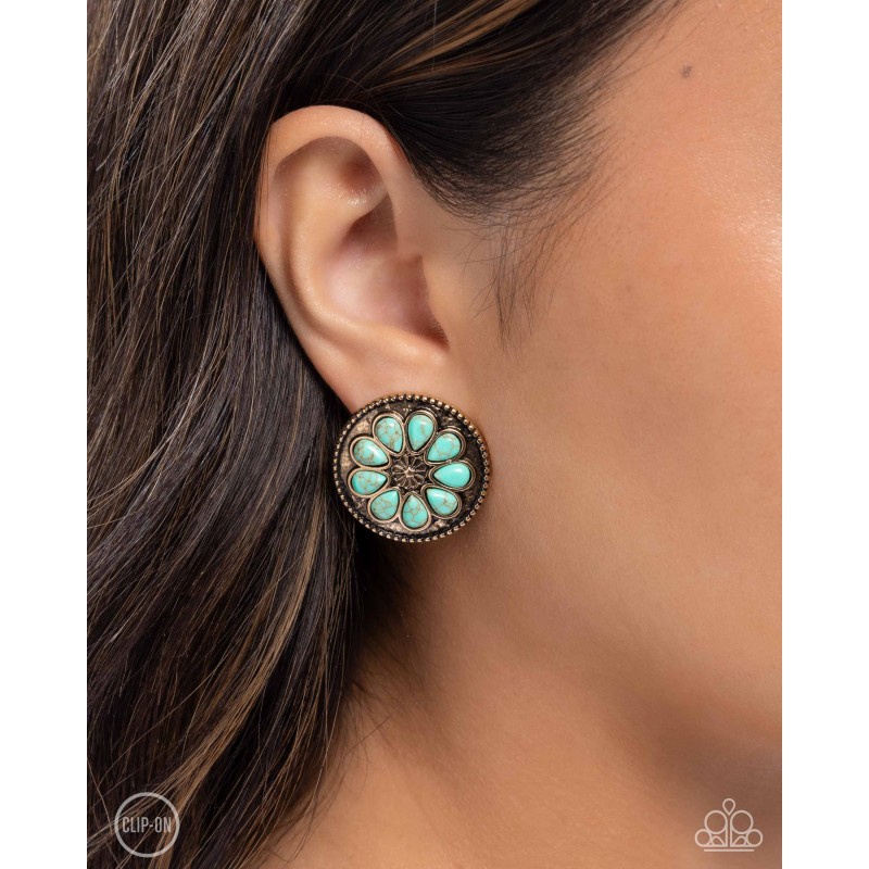 Antiqued gold frames encircle teardrop-shaped turquoise stones arranged in a floral-inspired design, creating a vintage charm. The textured gold and natural veining in the turquoise stones add depth to the intricate pattern. Earring attaches to a standard clip-on fitting. As the stone elements in this piece are natural, some color variation is normal.