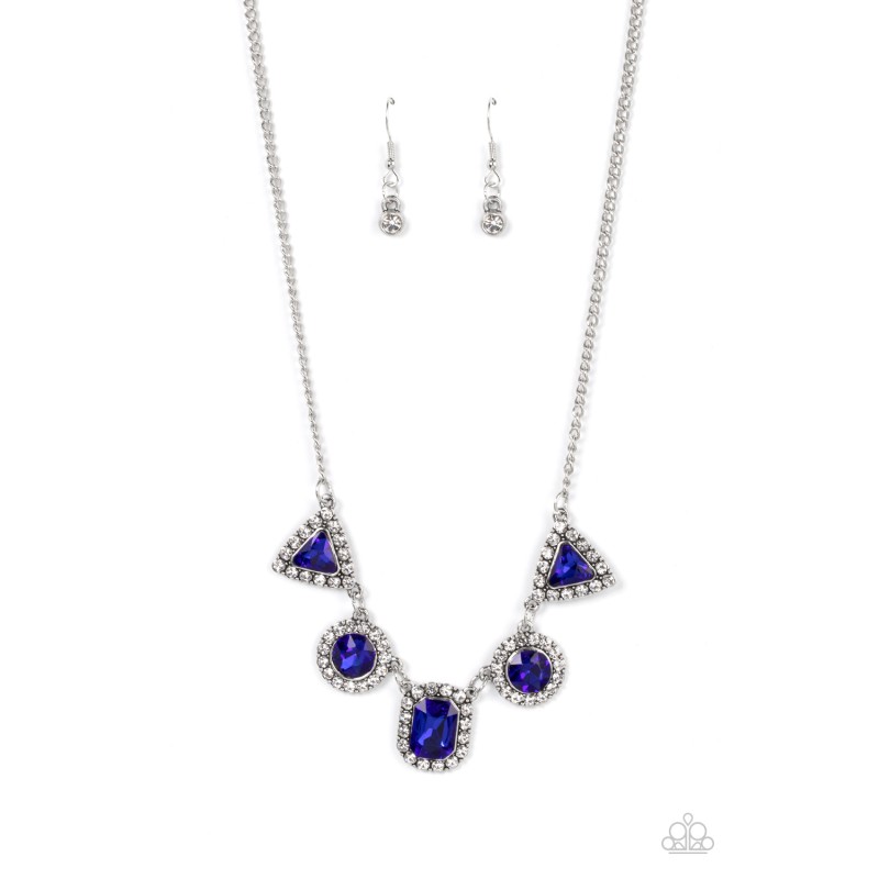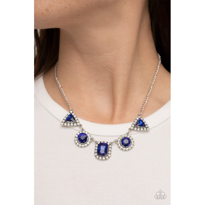 Featuring triangular, round, and emerald style cuts, a glittery collection of blue rhinestones are bordered in glassy white rhinestones as they delicately link below the collar for a sparkly statement. Features an adjustable clasp closure.