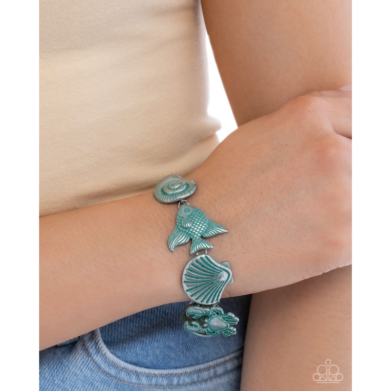 Brushed in a patina finish, a collection of coastal-inspired silver pendants including seashells, conch shells, textured angelfish, a crab, and a turtle coalesce around the wrist from a classic silver chain for a rustic, oceanic display. Features an adjustable clasp closure.