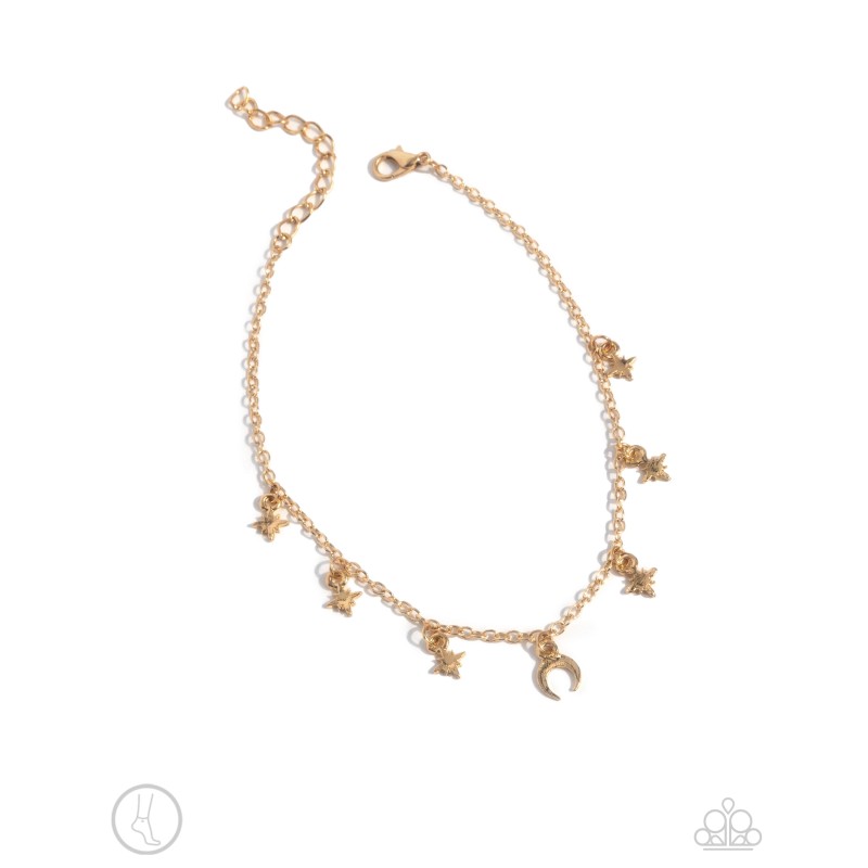 Swaying from a classic gold chain, a collection of dainty gold charms including three-dimensional stars and a tilted crescent moon coalesce around the ankle for a celestially chic display. Features an adjustable clasp closure.