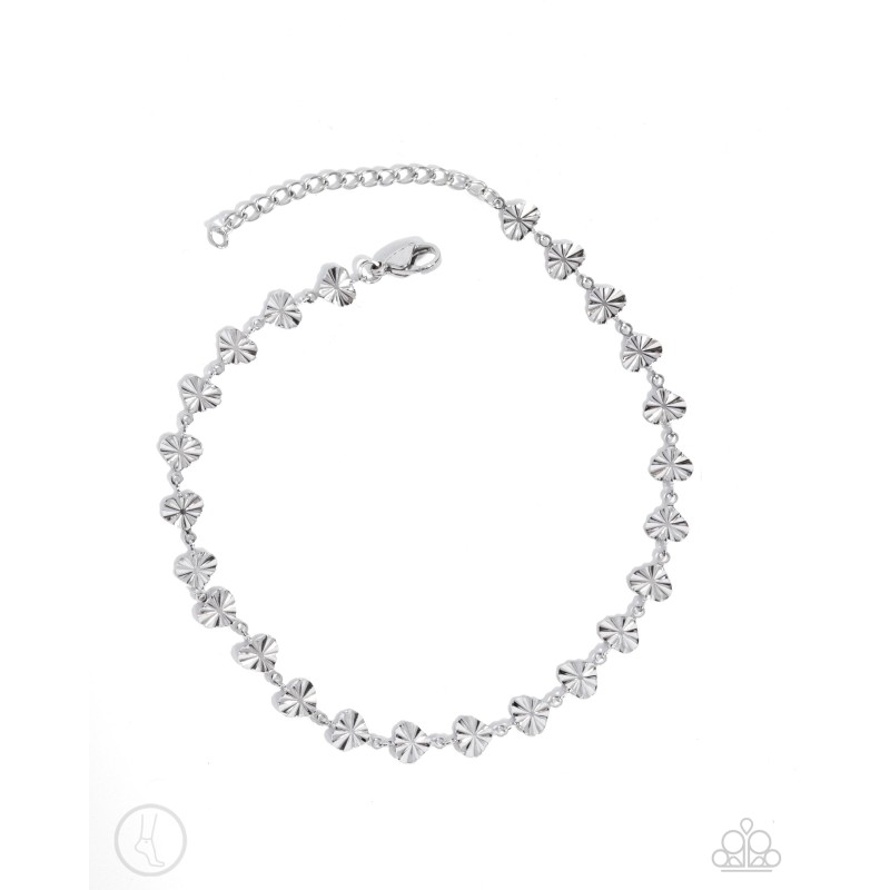 Featuring sunburst texture, a collection of stainless steel silver hearts loop around the ankle for a symmetrical, streamlined sweet look. Features an adjustable clasp closure.