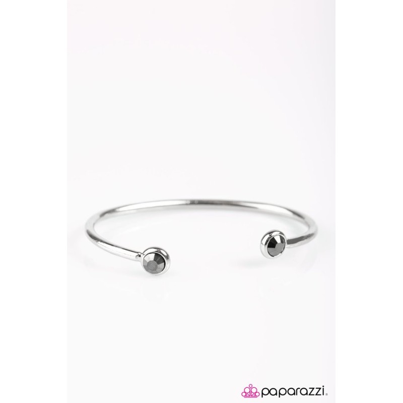 A shiny silver bar curls around the wrist, creating an open-cuff. Glittery hematite rhinestones adorn both ends of the cuff, adding glitzy accents to the refined display.