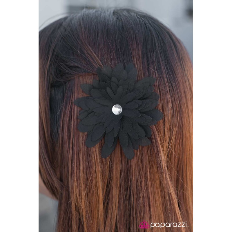 Soft black petals cascade from a sparkling rhinestone center in a delicate, flowing design. Features a standard duckbill clip and a pin on the back for endless accessorizing fun!