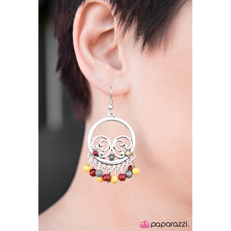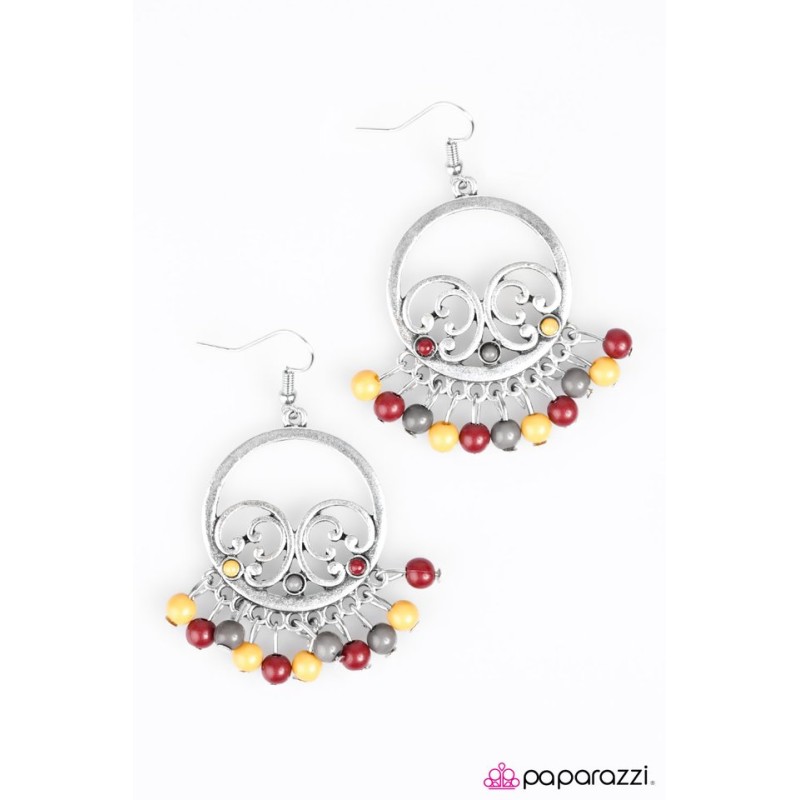 Glistening silver filigree dances into a whimsical frame. Colorful red, gray, and yellow beading swings from the bottom of the airy frame, creating a flirty fringe. Earring attaches to a standard fishhook fitting.
