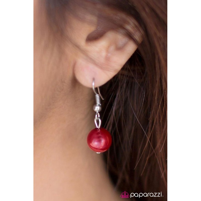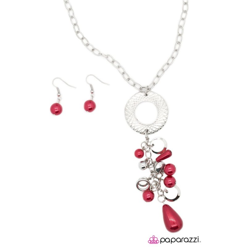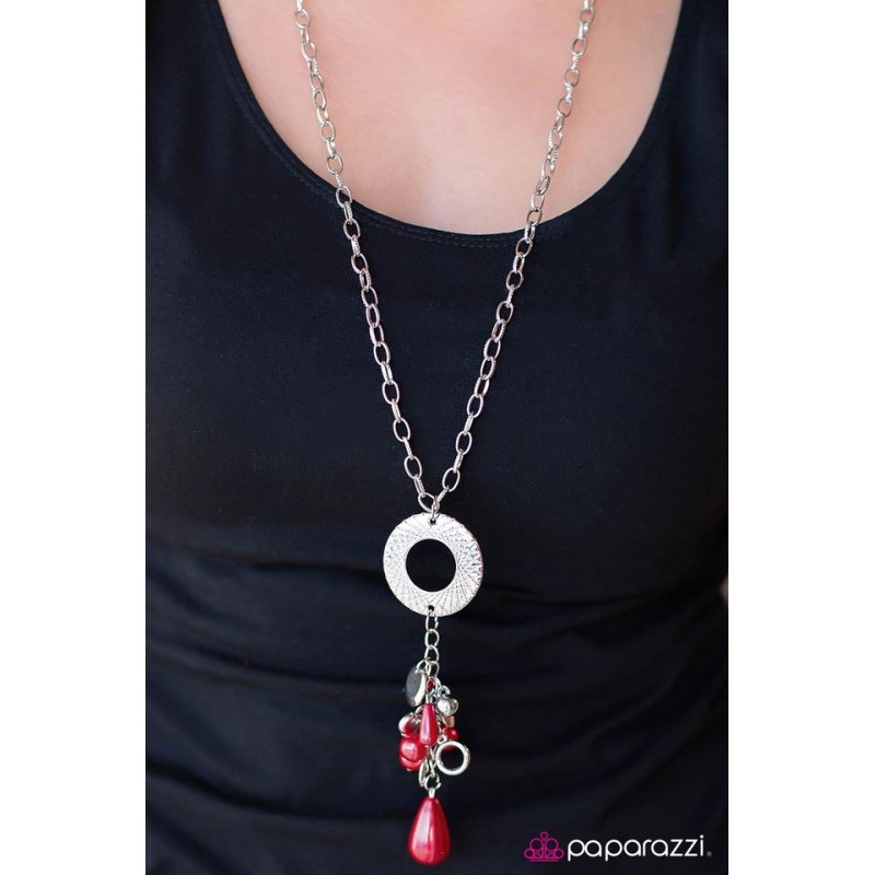 Two dainty silver chains are paired with two strands of shimmering red and silver beads brushed in a..