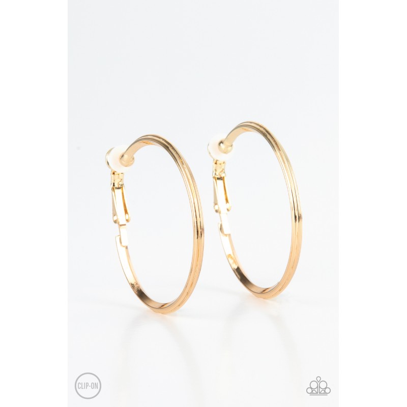 Etched in fine lines, a beveled gold hoop curls around the ear for a classic look. Hoop measures approximately 1 1/2" in diameter. Earring attaches to a standard clip-on fitting.