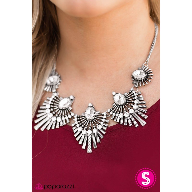 Textured metal bars flare out from a mesmerizing gem, creating a fringe of fanning frames. Sprinkled with matching white rhinestones, the dazzling display falls just below the collar for a sassy finish. Features an adjustable clasp closure.