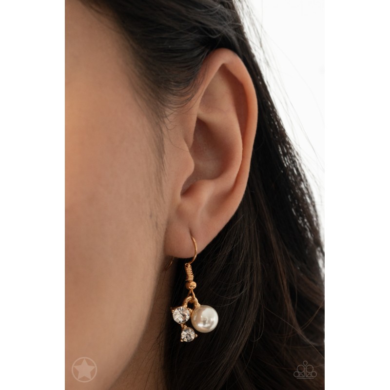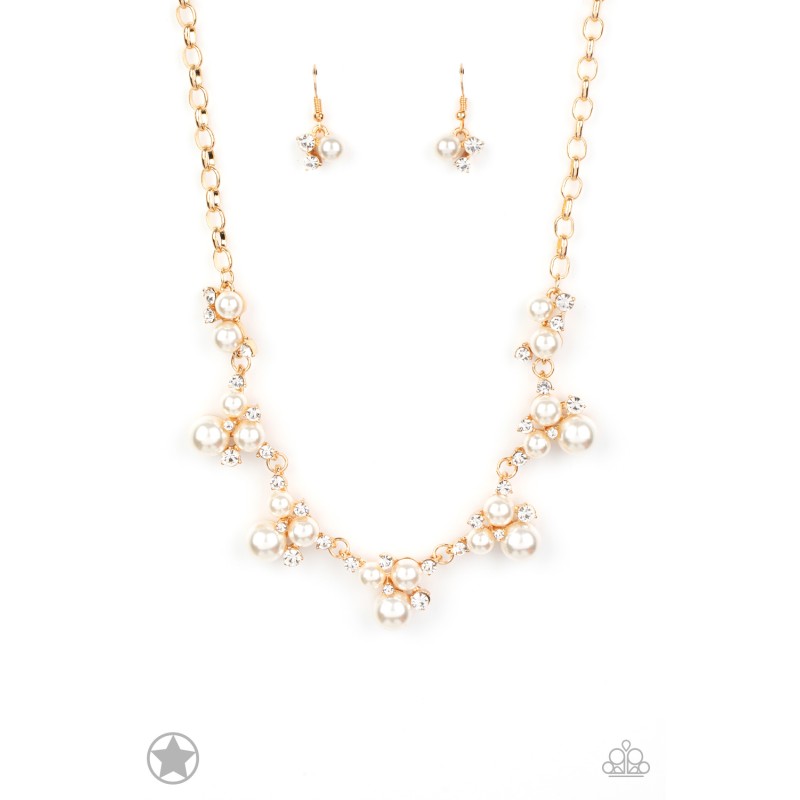 Clusters of pearls and dazzling white rhinestones join below the collar, creating refined frames. Infused with a glistening gold chain, the sections of luminescent frames trickle along the neck in a timeless fashion. Features an adjustable clasp closure.