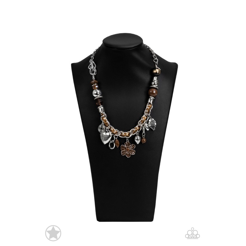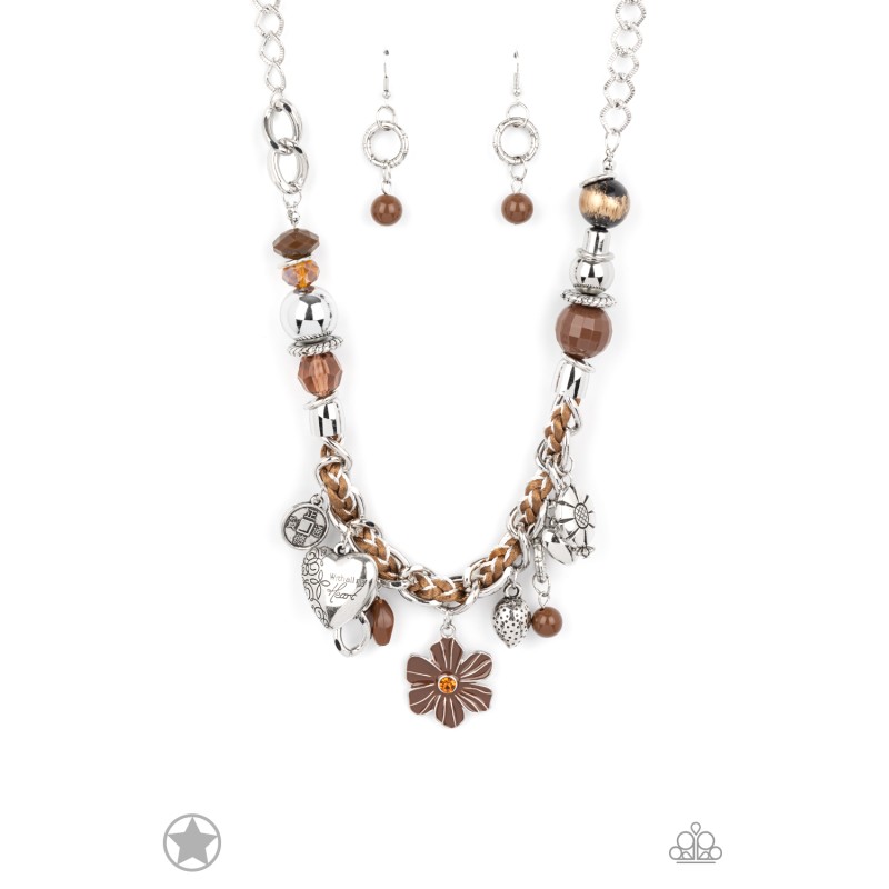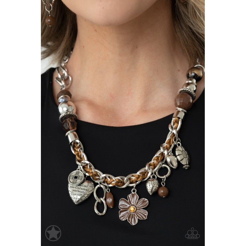 Brown and ivory cording is braided through a chunky silver chain. A unique variety of charms decorate the piece including a delicate flower and a heart inscribed with the phrase "With All My Heart" on one side and a short bible verse on the other that reads, "Love the Lord thy God with all your heart. Luke 10:27." Features an adjustable clasp closure.