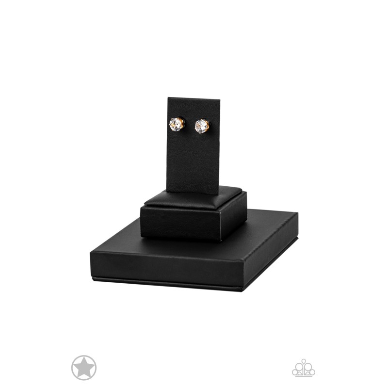A sparkling white rhinestone is nestled inside a classic gold frame for a timeless look. Earring attaches to a standard post fitting.