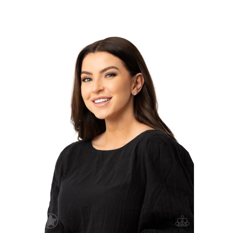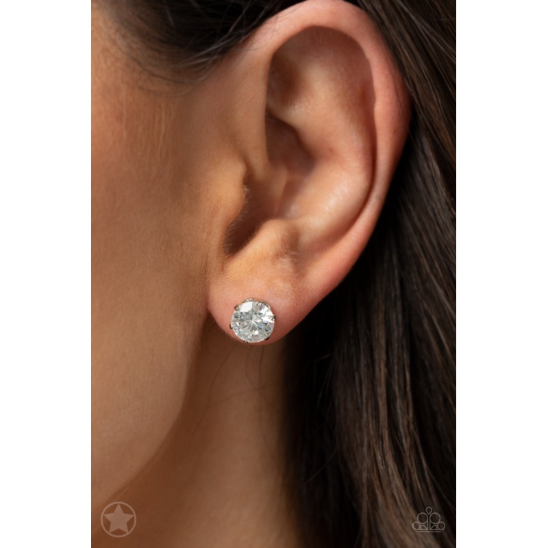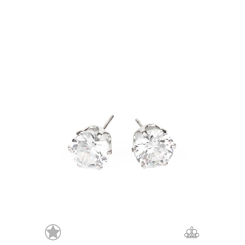 A sparkling white rhinestone is nestled inside a classic silver frame for a timeless look. Earring attaches to a standard post fitting.