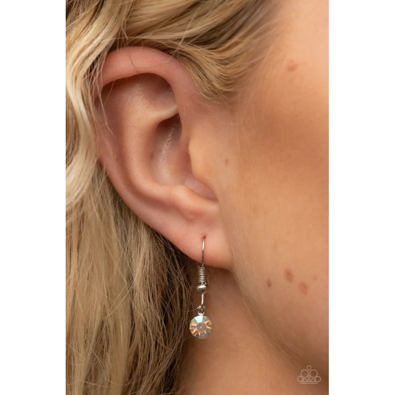 An iridescent heart-shaped gem is pressed into a simple silver frame at the end of a silver box chain creating an adorable sentiment below the collar. Features an adjustable clasp closure. Sold as one individual necklace. Includes one pair of matching earrings.