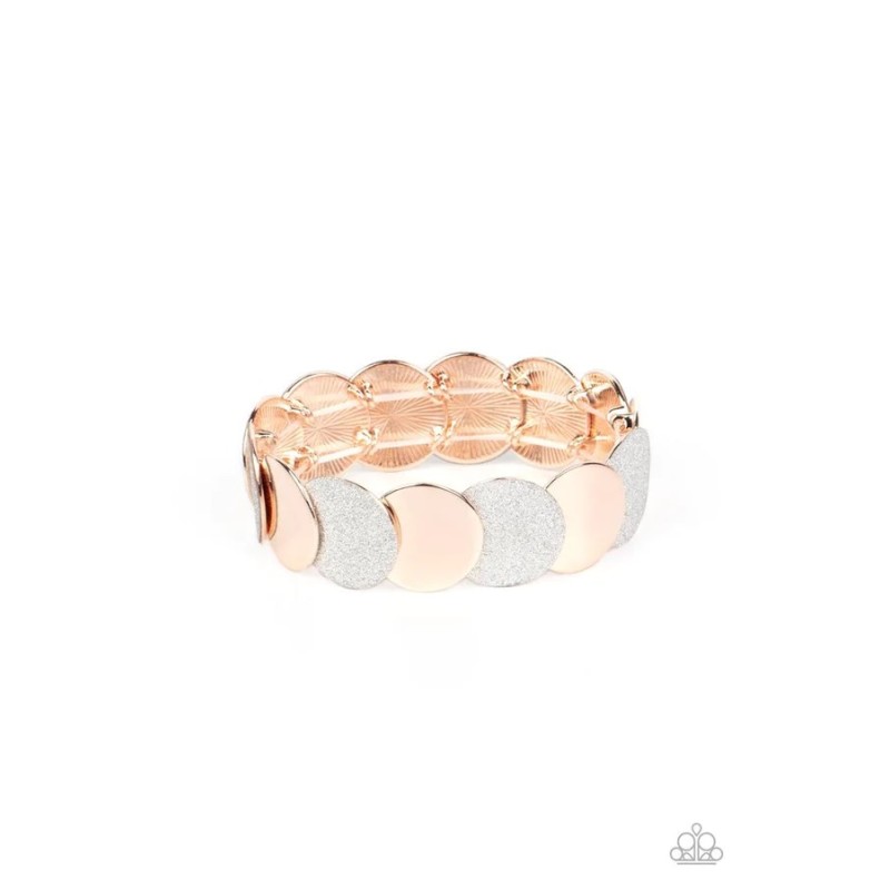 A glimmering collection of shiny rose gold discs and glitter coated rose gold discs delicately overlap along stretchy bands around the wrist, creating a dazzling hint of shimmer.