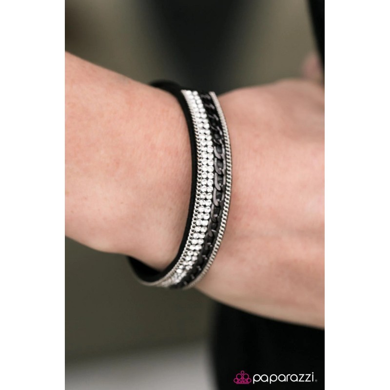 Rows of dainty silver chain, glittery white rhinestones, and a strand of glistening gunmetal embellish a strip of black suede. The mishmash of glittery texture wraps around the wrist, creating a sassy palette. Features an adjustable snap closure.