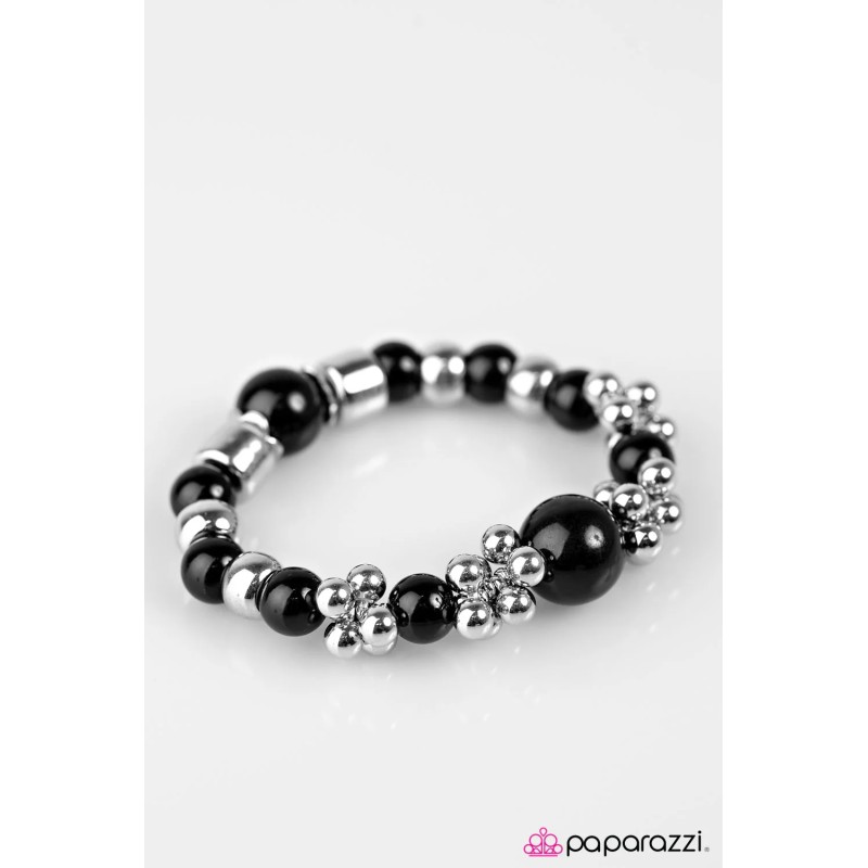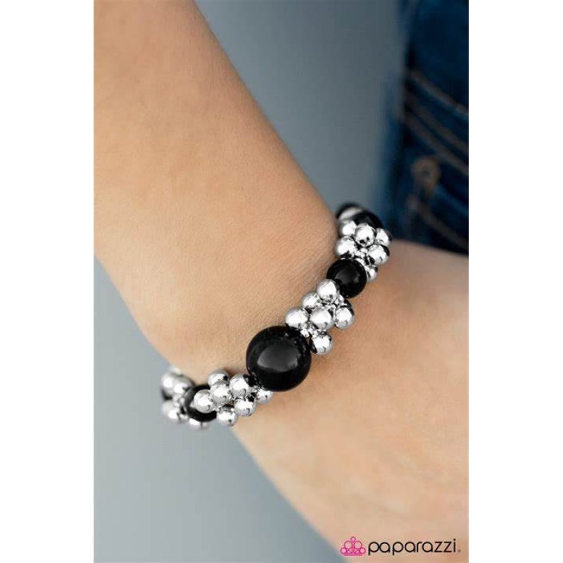 Shimmery silver discs join cerise beads in varying opacity along two shimmery silver chains, creatin..