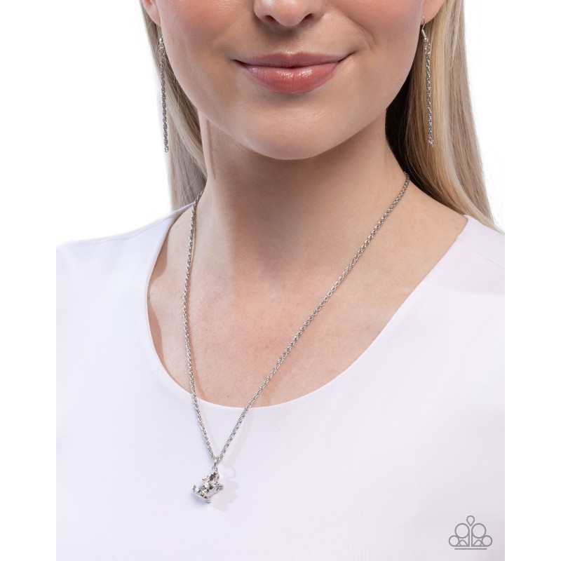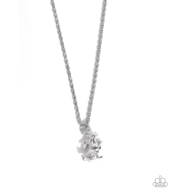 A shiny silver rope chain, adorned with an intricately detailed silver rabbit pendant, sits playfully below the collar. Features an adjustable clasp closure.