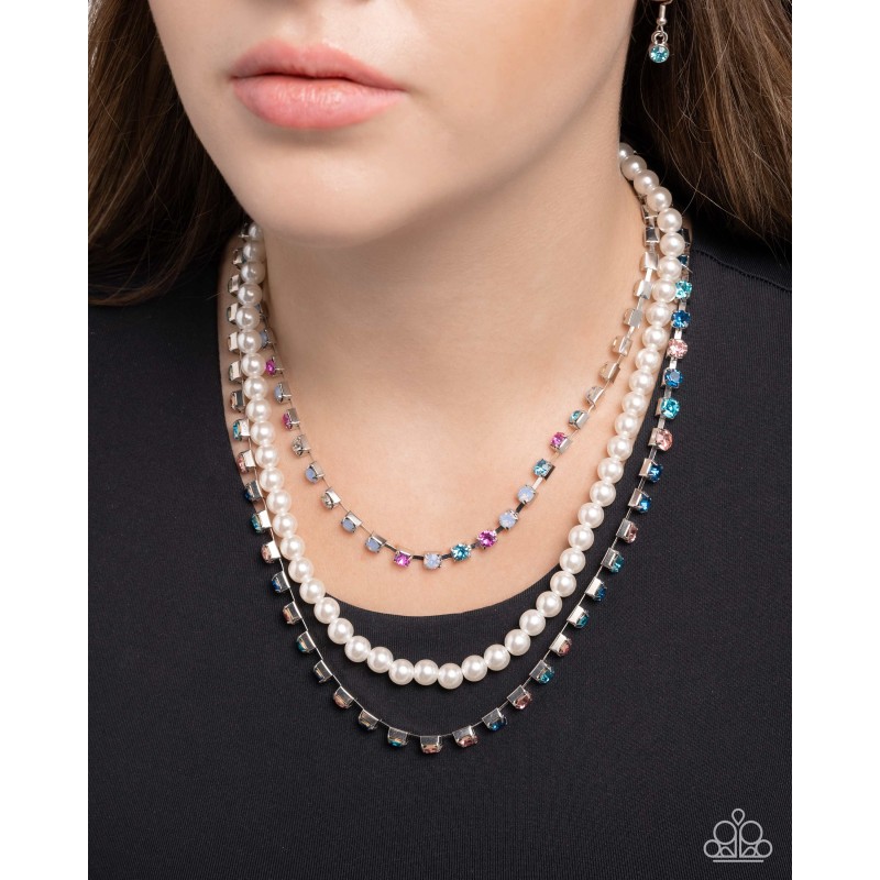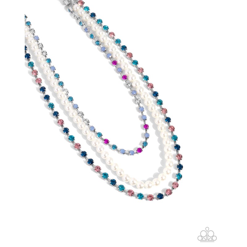 Pressed in pronged silver square fittings, aquamarine, blue zircon, and light rose rhinestones join a strand of glossy white pearls, and an additional silver square-pronged strand featuring air opalescent, aquamarine, fuchsia, and white rhinestones for a shimmery layered look. Features an adjustable clasp closure.
