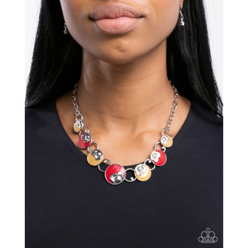 Connecting to a silver cable chain, a collection of silver rings, white rhinestone-dotted silver rings, and Saffron and red-painted hammered discs with textured silver floral overlays alternate and pattern below the neckline for a whimsical pop of color and flair. Features an adjustable clasp closure.