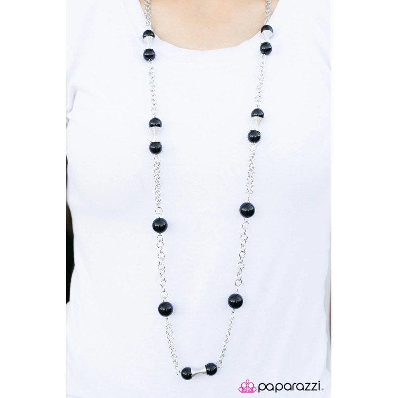 Long chain of black crystalized beads, curved plates of silver with a pearly finish, and chunky silv..