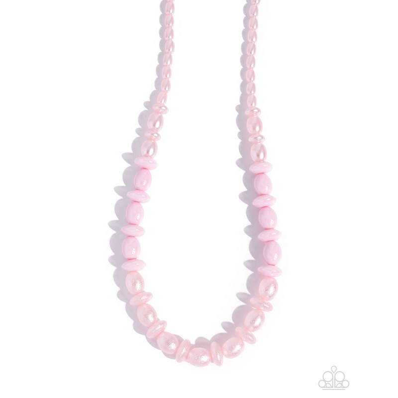 Infused along an invisible string, a collection of baby pink pearls in varying shapes, baby pink milk iridescent beads in varying shapes, and crackle baby pink pearls pattern below the neckline in sections for a pop of princess color. Features an adjustable clasp closure. Due to its prismatic palette, color may vary.