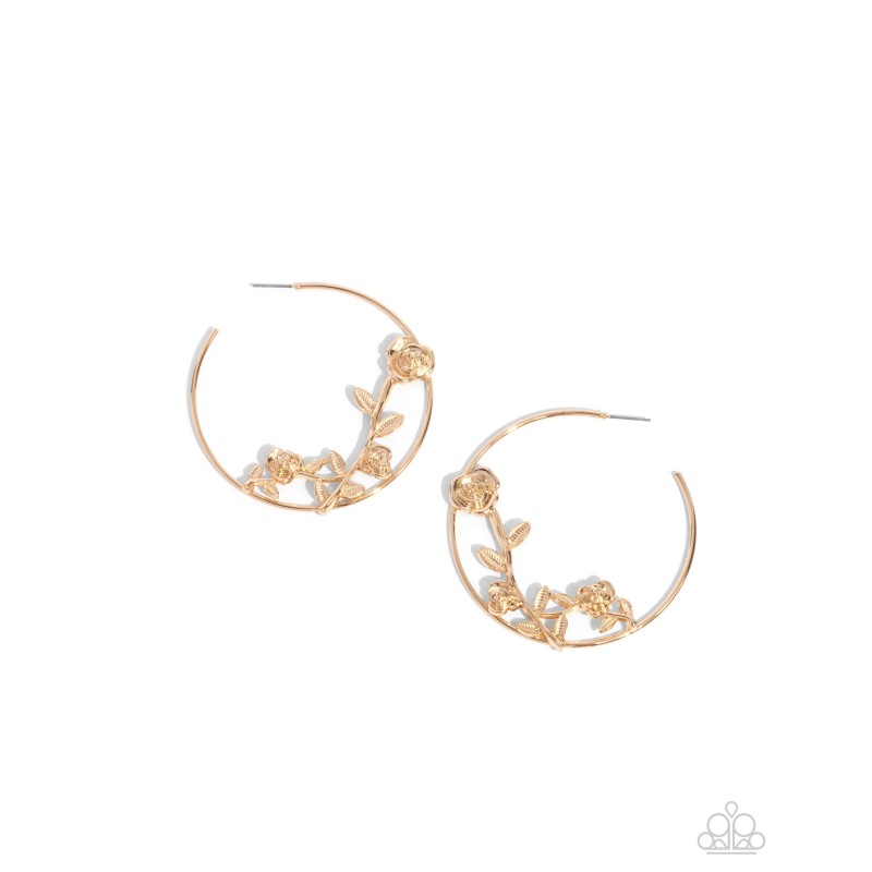Featuring subtle texture, a gold rose stem featuring various roses and leaves blooms along the inner circumference of a thin gold hoop for a simply stunning whimsical display. Earring attaches to a standard post fitting. Hoop measures approximately 2 1/4" in diameter.
