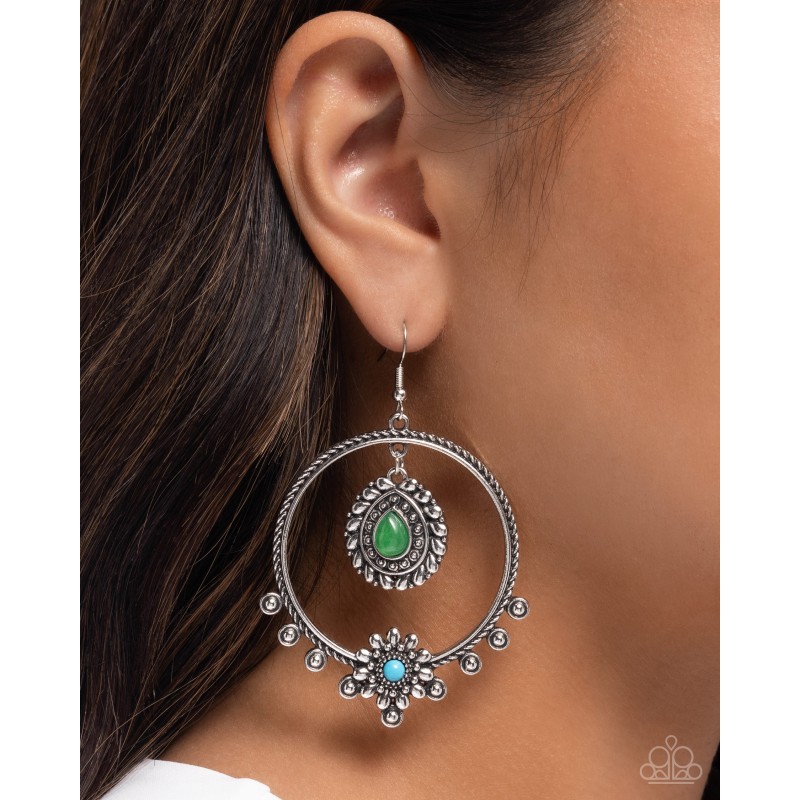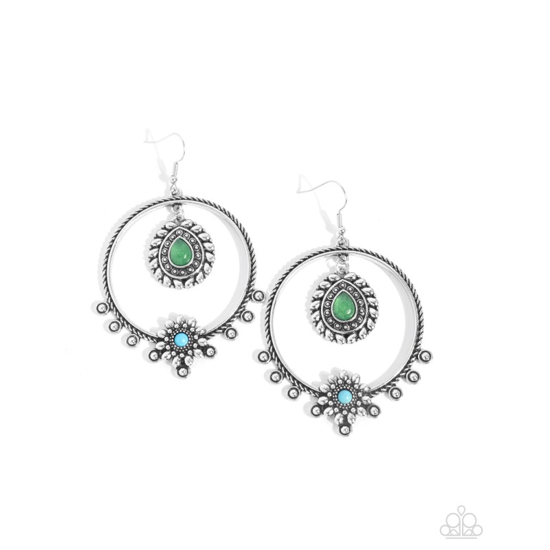 Dotted with a jade stone, a dainty textured and studded teardrop frame swings from the top of a textured silver hoop featuring additional silver beaded detail and a silver-studded flower with a turquoise stone centerpiece for a trendy colorful lure. Earring attaches to a standard fishhook fitting. As the stone elements in this piece are natural, some color variation is normal.