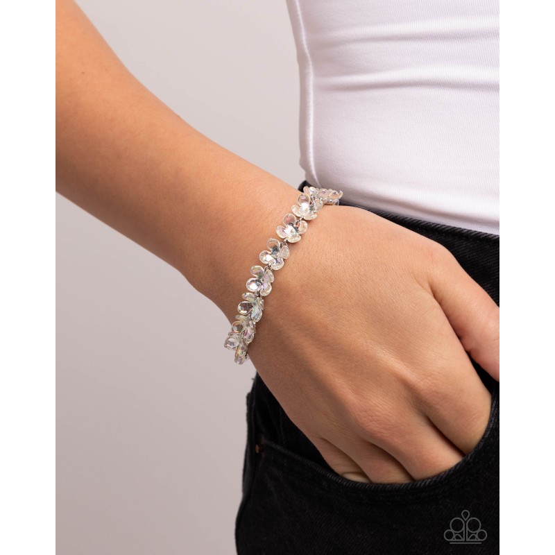 Iridescent acrylic flowers are linked along a silver chain, creating a glimmering floral display around the wrist. Features an adjustable clasp closure.