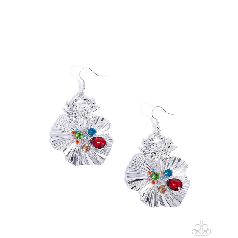 Suspended below a crab-shaped frame, a textured silver shell-like frame holds a cluster of vibrant multicolored rhinestones. The various shapes and cuts of the gems add depth and character to the whimsically coastal vibe. Earring attaches to a standard fishhook fitting.