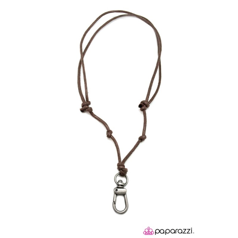 A simple brown cord is knotted into an urban inspired display. A lobster clasp hangs from the bottom of the design to allow a name badge or other item to be attached. A sliding knot closure allows for an adjustable fit.